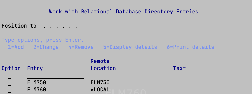 What do we need? First of all, it is essential that the database of ‘remote’ machines be registered in the central system’s database address book. To verify that this is the case, use the command WRKRDBDIRE and, if necessary, add 1 (or use the command ADDRDBDIRE):