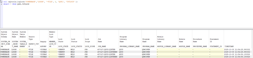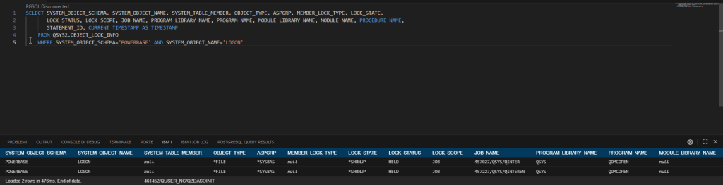 As you can see, it gives us a lot of information. Let’s go back for a moment to the customer’s primary need, which is to understand who placed blocks on a specific object and when, so we’ll start modifying the query. In this case, we’ll take less information, so I’ll select only a few fields: SELECT SYSTEM_OBJECT_SCHEMA, SYSTEM_OBJECT_NAME, SYSTEM_TABLE_MEMBER, OBJECT_TYPE, ASPGRP, MEMBER_LOCK_TYPE, LOCK_STATE, LOCK_STATUS, LOCK_SCOPE, JOB_NAME, PROGRAM_LIBRARY_NAME, PROGRAM_NAME, MODULE_LIBRARY_NAME, MODULE_NAME, PROCEDURE_NAME, STATEMENT_ID, CURRENT TIMESTAMP AS TIMESTAMP FROM QSYS2.OBJECT_LOCK_INFO WHERE SYSTEM_OBJECT_SCHEMA='XXXXXX' AND SYSTEM_OBJECT_NAME='XXXXX'